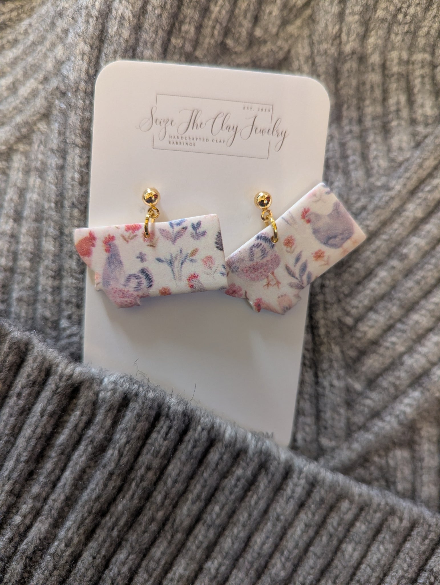 Cluck into Montana style! These quirky clay earrings combine two things we love—the Big Sky State and adorable printed chickens. Hand-sculpted by a local artisan, each earring features Montana's distinctive shape paired with charming poultry details. Perfect for farm lovers, chicken enthusiasts, and anyone who appreciates a playful twist on regional pride. Lightweight and full of personality, these earrings are sure to ruffle some feathers (in the best way)! Custom Designed for our Shop!