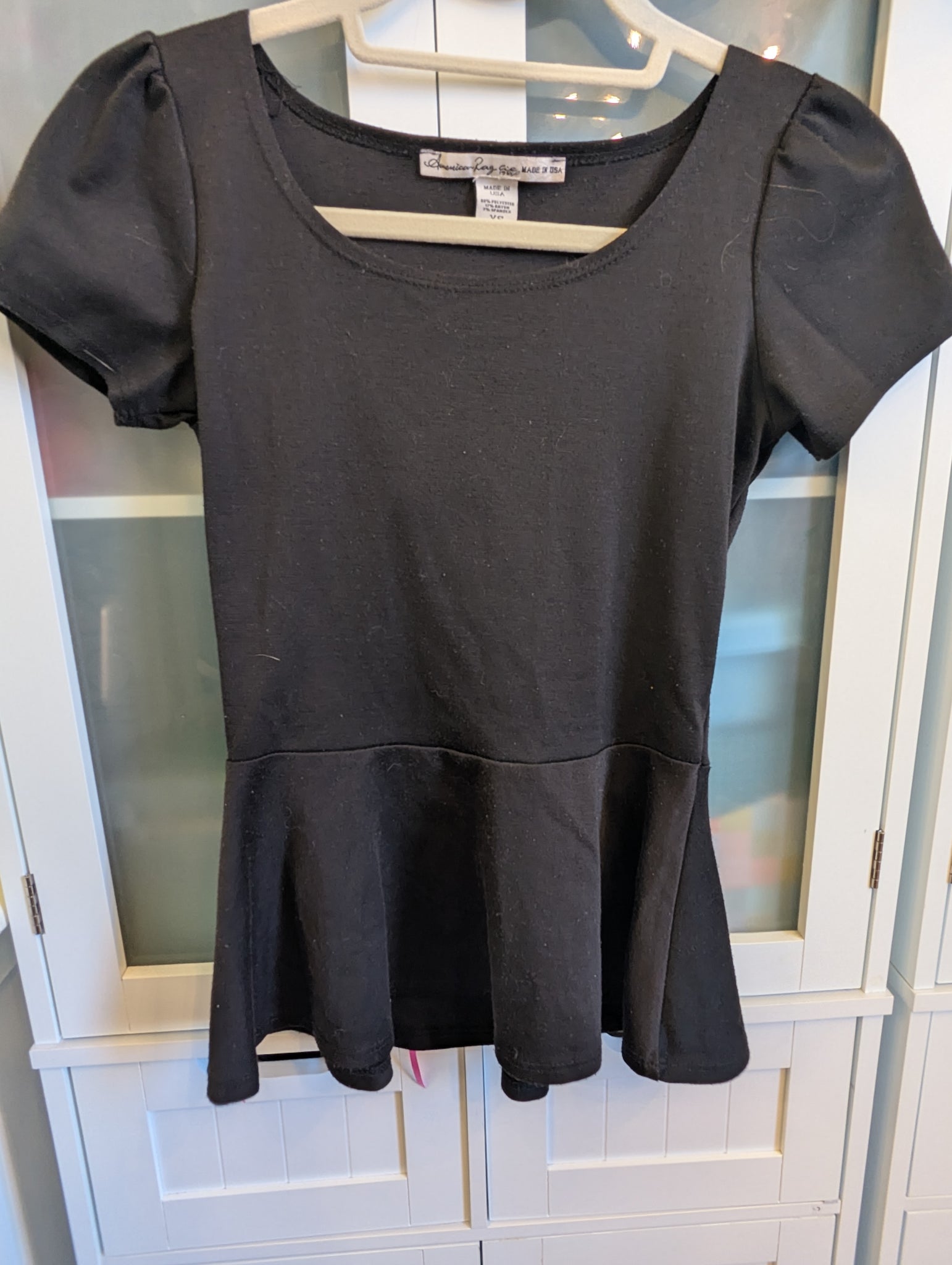 Elevate your basics with this chic black peplum top! The fitted silhouette pairs perfectly with your favorite jeans or skirts, while the playful peplum detail adds just the right amount of sass. Versatile enough for casual outings or dressed up for a night out, this wardrobe essential delivers style without the fuss. A timeless piece that works as hard as you do. Made in USA