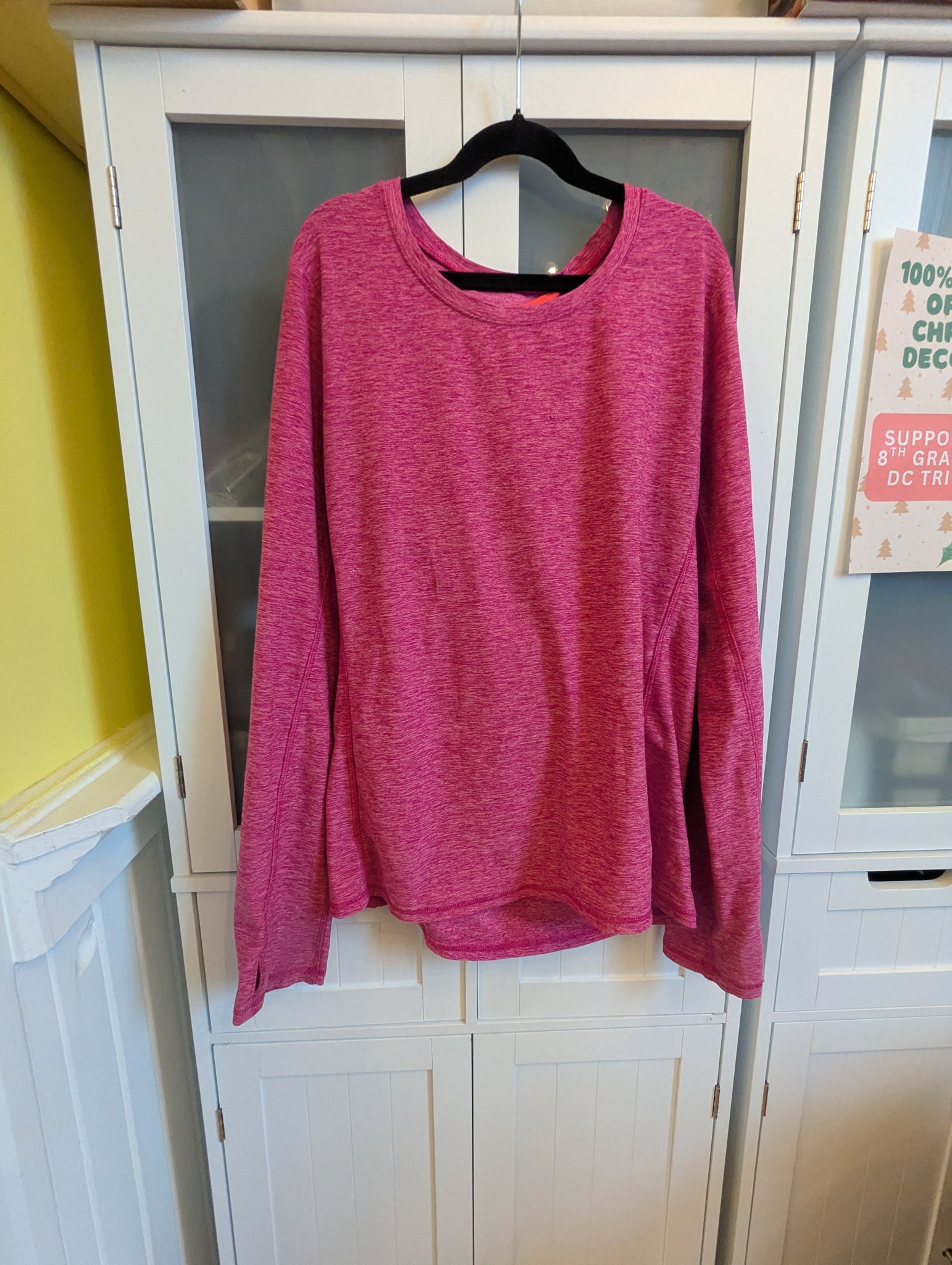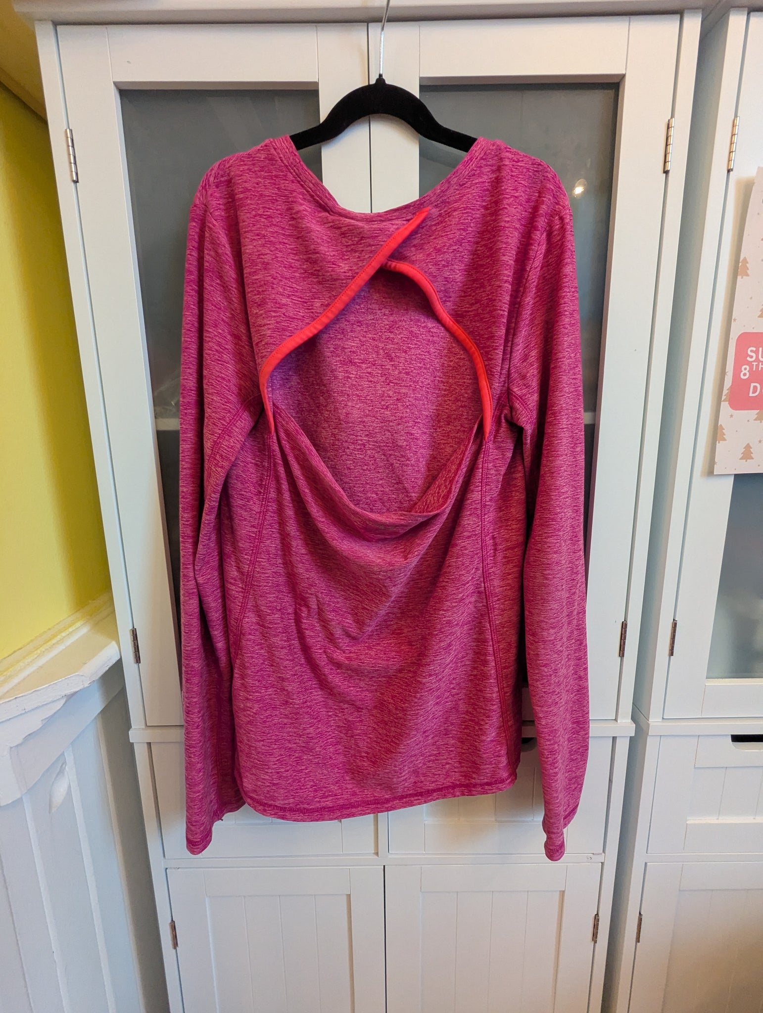 Get ready to turn heads with this vibrant pink long sleeve that's anything but ordinary. The playful back cutout adds a flirty touch to your workout or casual look, while thumb holes keep sleeves in place during your most active moments. Perfect for layering or showing off on its own. Note: This style runs small, so size up for the perfect fit!