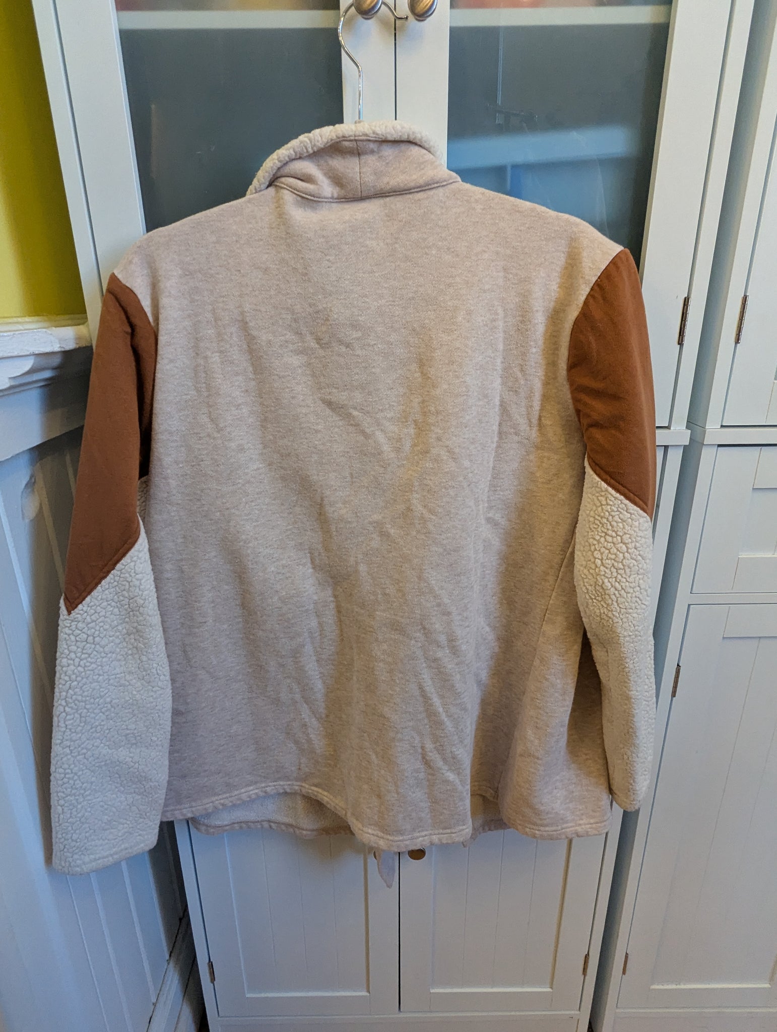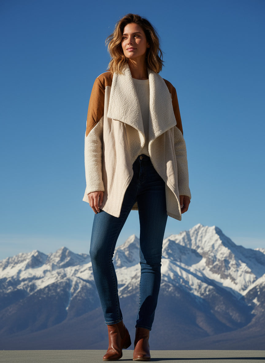 Layer up in cozy, textured style with this cream-colored cardigan that's anything but ordinary. The clever patchwork design blends soft fleece with supple suede, creating visual interest and tactile appeal that makes this piece a conversation starter. The relaxed, open cardigan silhouette drapes beautifully over your favorite tees and dresses, offering warmth without the bulk. Perfect for those moments when you want to add dimension to your outfit while staying snug and comfortable. Throw it on and let your playful side shine through!